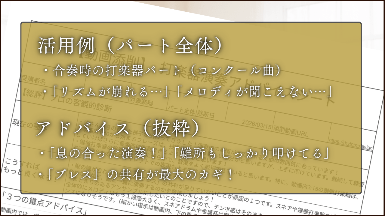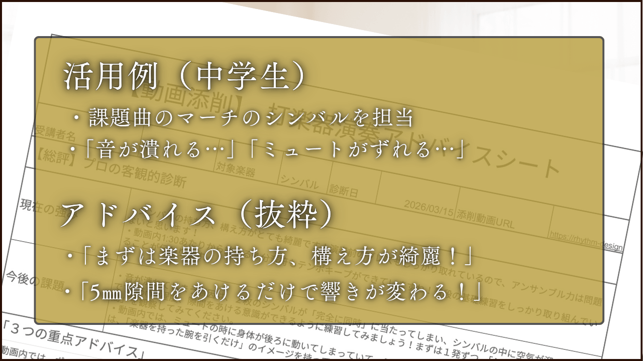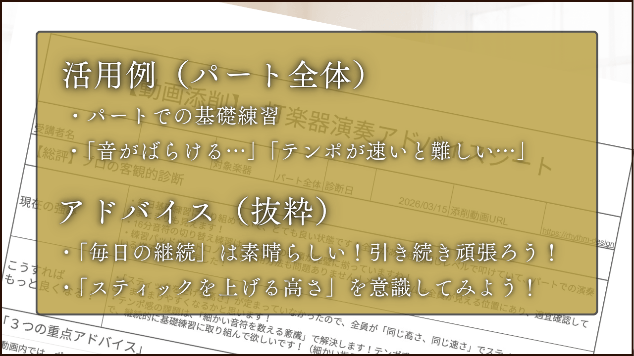 何度でも見返せる: 合奏中に言われたことは忘れてしまいがちですが、このアドバイスは動画とシートで残るため、復習に最適です。